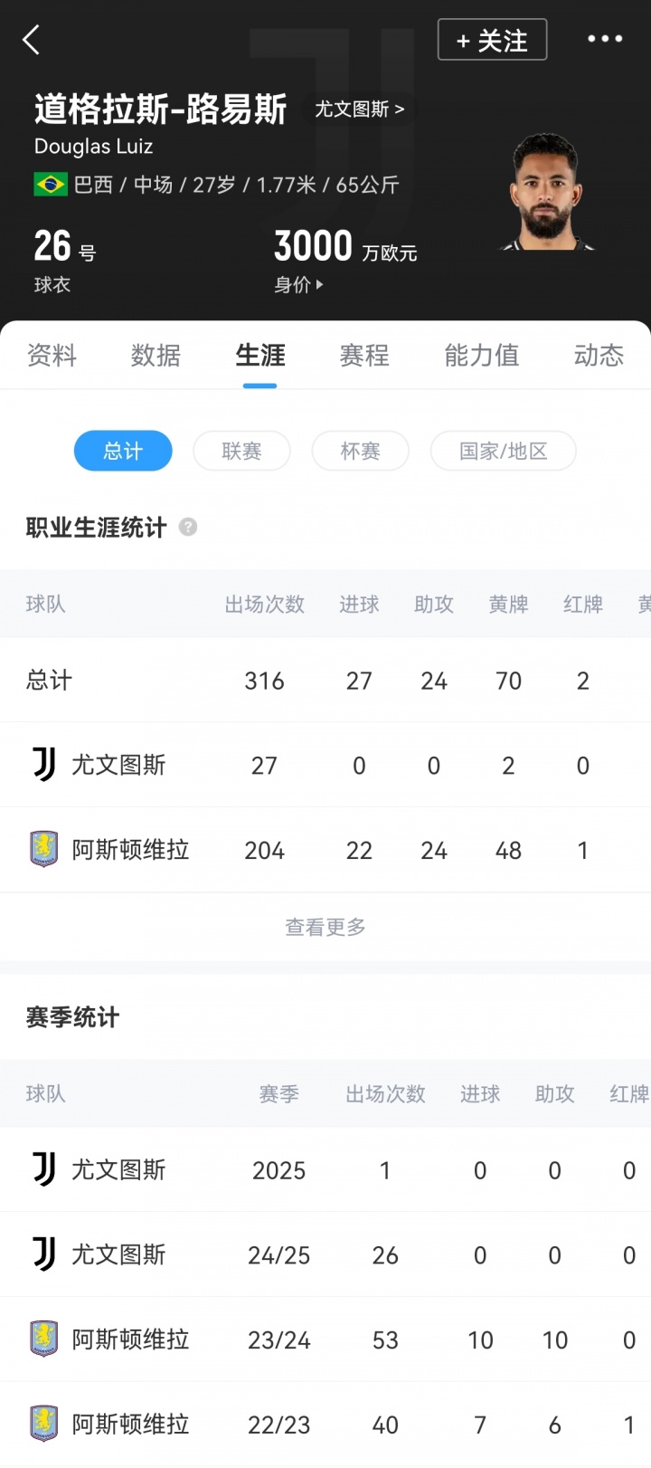 道格拉斯-路易斯去年夏窗以5150万欧元的转会费从维拉加盟尤文,但整个2024/25赛季,道格拉斯-路易斯只出场26次,没有贡献任何进球或助攻。